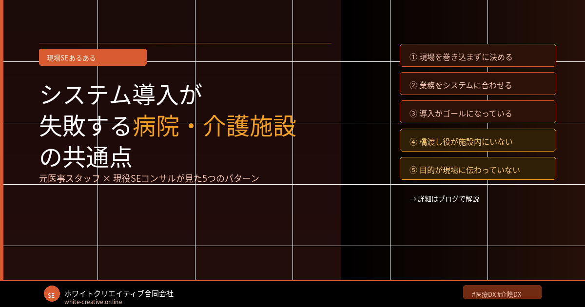 これまでに医療・介護施設へのシステム導入を何件も経験してきた。成功した案件もあれば、正直に言えば途中で頓挫したものもある。そして失敗した案件を振り返ると、驚くほど共通するパターンがある。ベンダーが悪いわけでも、施設側が怠慢なわけでもない。ほとんどの場合、構造的な問題だ。