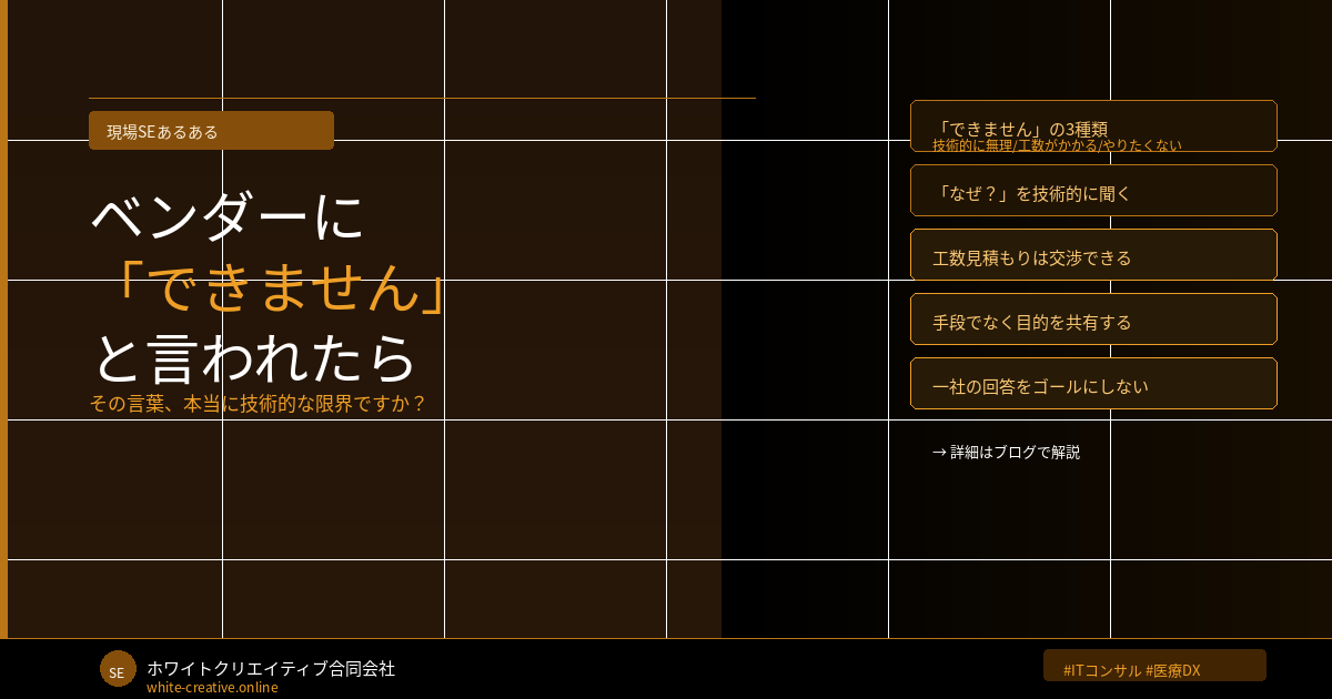 プログラマー出身のコンサルとして、ベンダーの提案書や回答を技術レベルで確認できる立場から言うと、「できません」にはいくつかの種類があります。今回はその見分け方と、対処法を整理してみます。