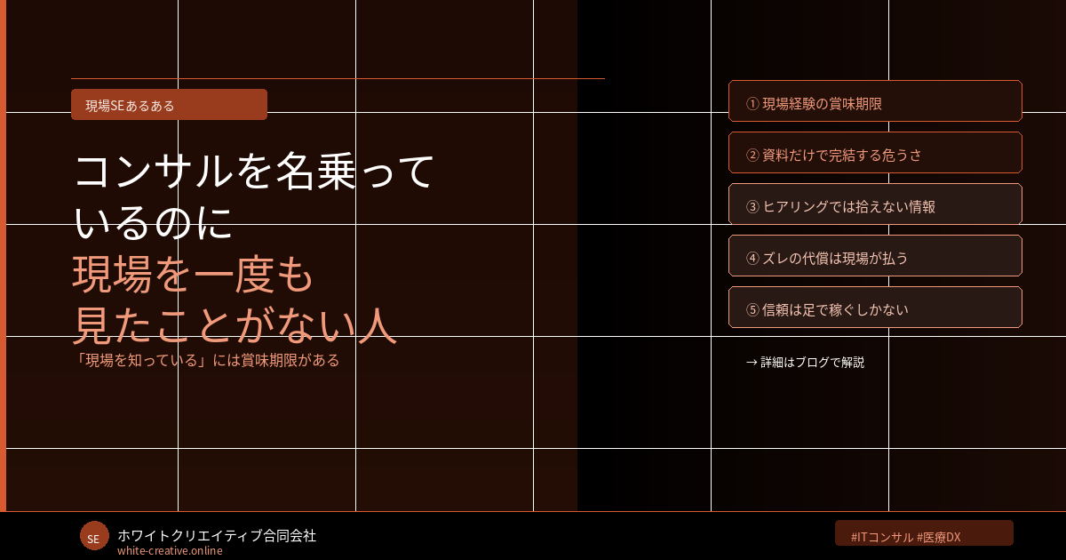 医療・介護のITコンサルをしていると、同業者と話す機会があります。その中で、たまに出会うのが「現場に一度も足を運んだことがない」コンサルです。提案書は立派で、資料の見栄えもよく、話も上手い。でも実際の病院や介護施設の現場を自分の目で見たことがない。