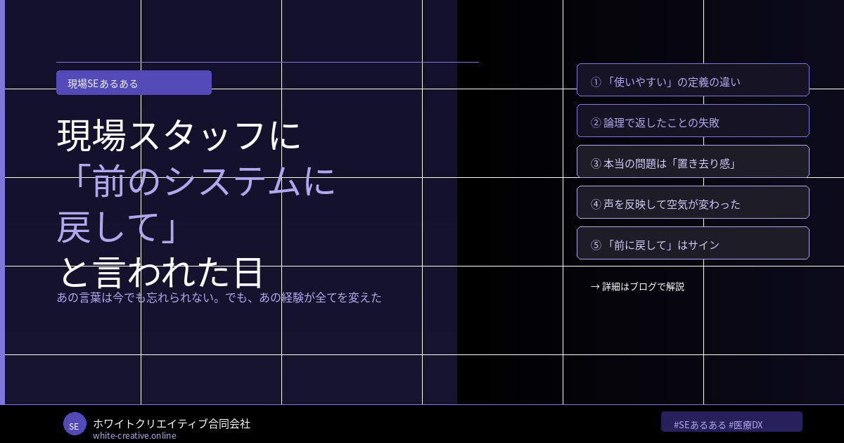 現場スタッフの「前に戻して」という言葉は、システムへの拒絶ではなく「もっと関わりたい」というサインであることが多いです。その声を入口にして、一緒に作り直す姿勢を持てるかどうかが、SEとしての分岐点になります。